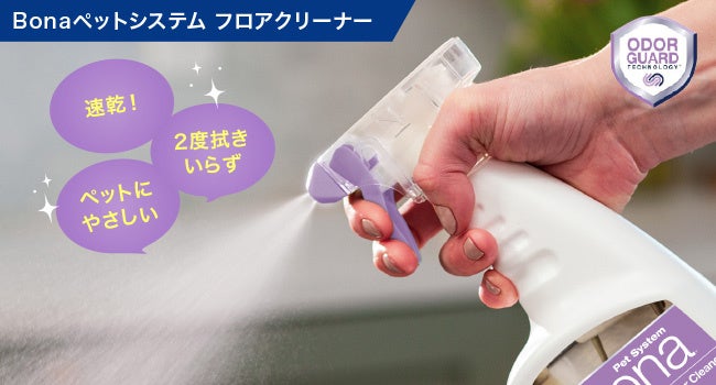 床用クリーナー『Bonaペットシステムフロアクリーナー』は、Bona社がペット専用に開発しました。特殊技術「ニオイガードテクノロジー」を採用。床にスプレーして拭くだけで、ペットの尿や便、唾液の臭いを除去します。