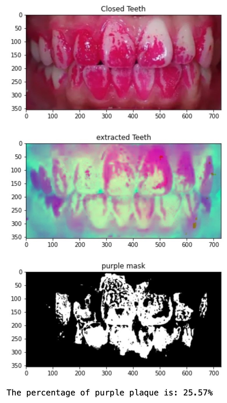 ご⾃宅で⻭磨き後のプラーク量を染め出しによって⾒える化し、AI解析によって数値化、磨き具合によっ