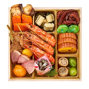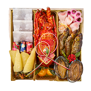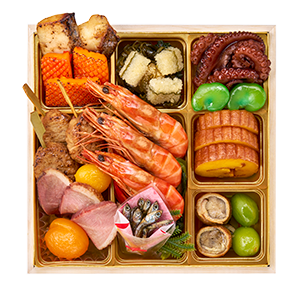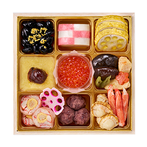 ・国産黒豆蜜煮 金箔のせ ・紅白蒲鉾 ・からし蓮根 ・スイートポテトきんとん ・渋皮栗甘露 ・味付いくら ・国産椎茸旨煮 ・柔らか海老真丈 ・味付蕗 ・金時人参 ・かに水車巻 ・花れんこん ・一口おはぎ ・帆立潮煮 ・かに風味土佐酢漬