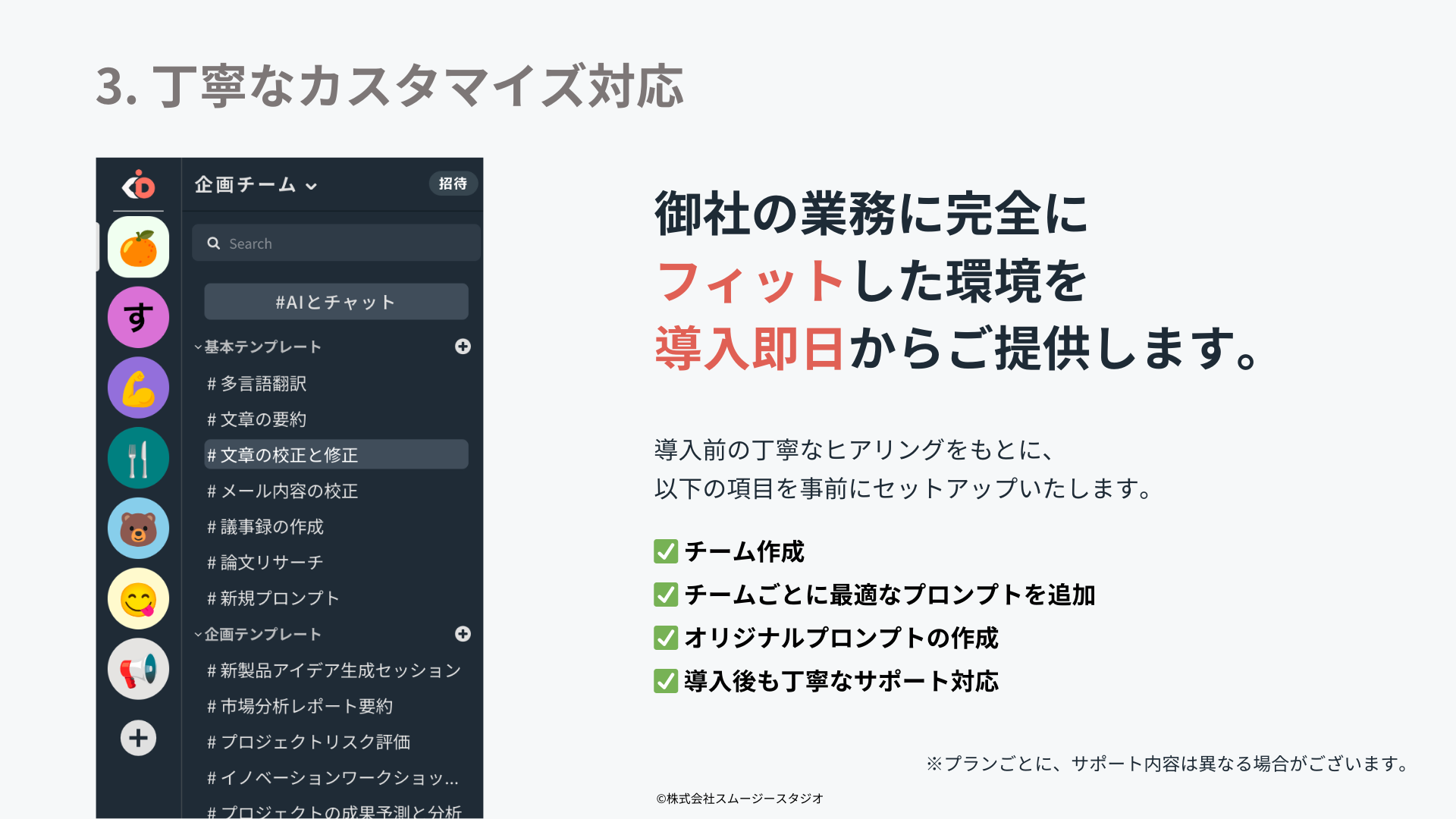 ■導入前の丁寧なヒアリングに基づき、チーム作成や最適なプロンプトの追加、オリジナルプロンプトの作成など、企業ごとの業務に完全にフィットする環境を導入初日から提供します。導入後も丁寧なサポートを行います。