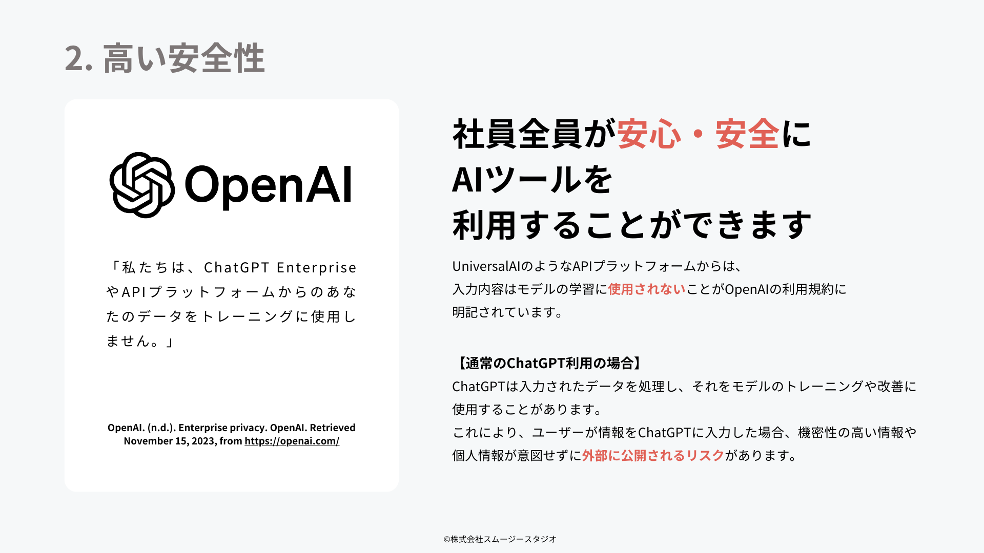 ■Universal AIのようなAPIプラットフォームからは、⼊⼒内容がモデルの学習に使⽤されないことがOpenAIの利用規約に明記されています。そのため、⾼い安全性を確保し、企業利用でも安心の作業環境を提供しています。