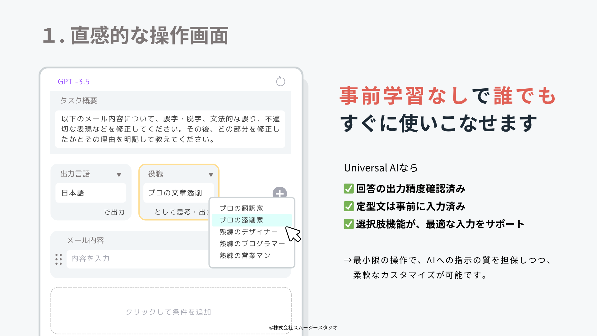 ■Universal AIは、直感的な操作画面を備えており、事前学習なしで誰でも簡単に利用できます。