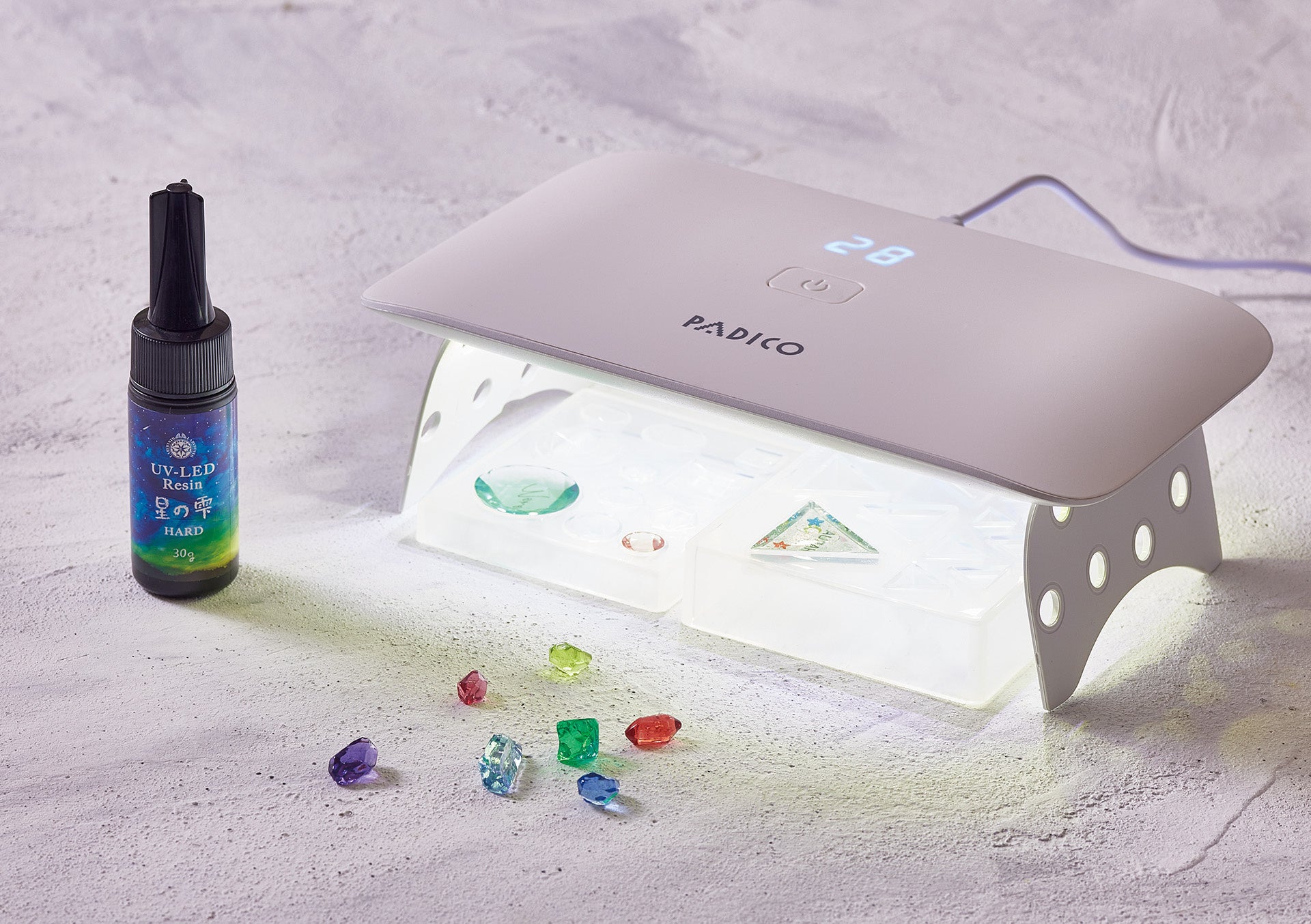 透明な樹脂(レジン)の液体で、UVライトやLEDライトや太陽光などにあてることで硬化します。モールドにレジンを注ぎ、ライトで照射して硬化させることで、透明のパーツを数分で作ることができます。アクセサリー制作におすすめの素材です。