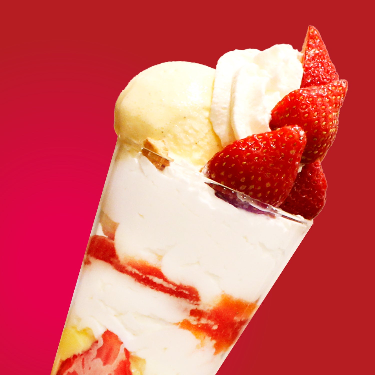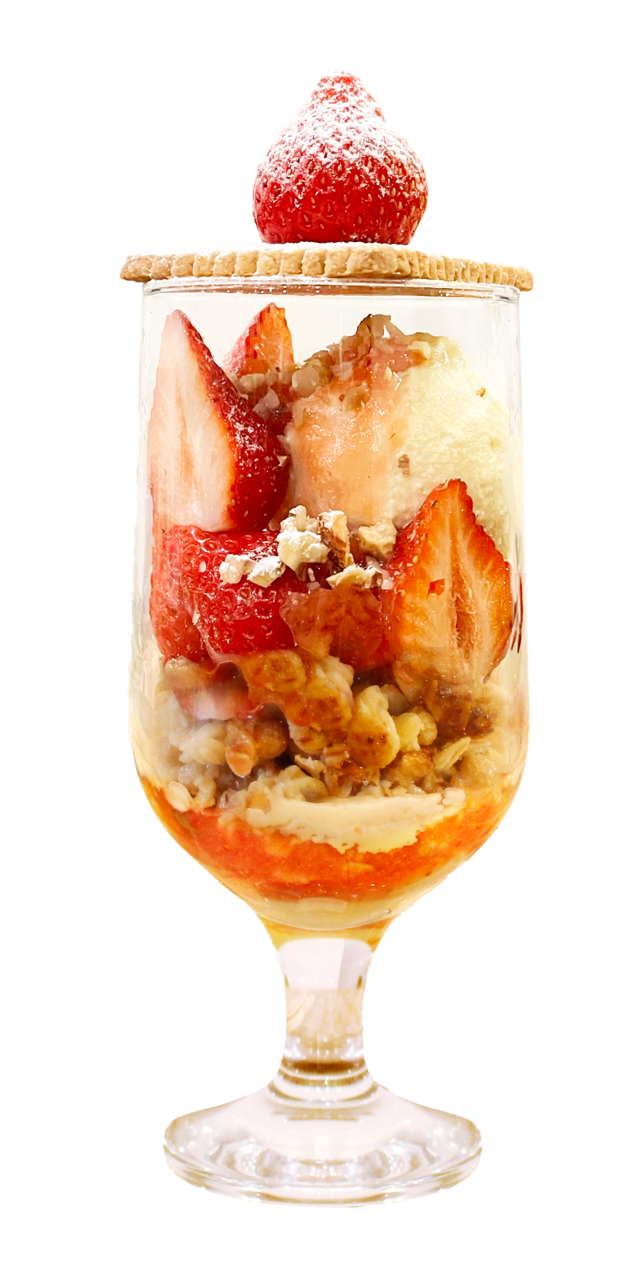 商品説明:芳醇なバニラアイス、さっくり食感のあるフルーツグラノーラに、爽やかな甘みと酸味のある「あまおう」を贅沢に使い、食感と素材の味を楽しめるパフェに仕上げました。