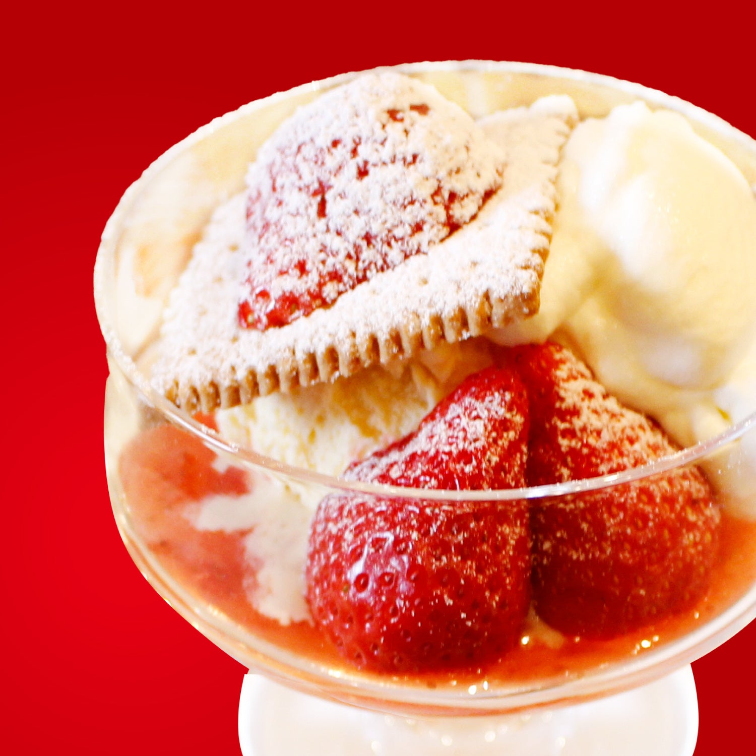 商品説明:バニラアイスに、いちごソースと旬の味が楽しめる「あまおう」を添えた絶妙なバランス。食後のデザートにおすすめ。