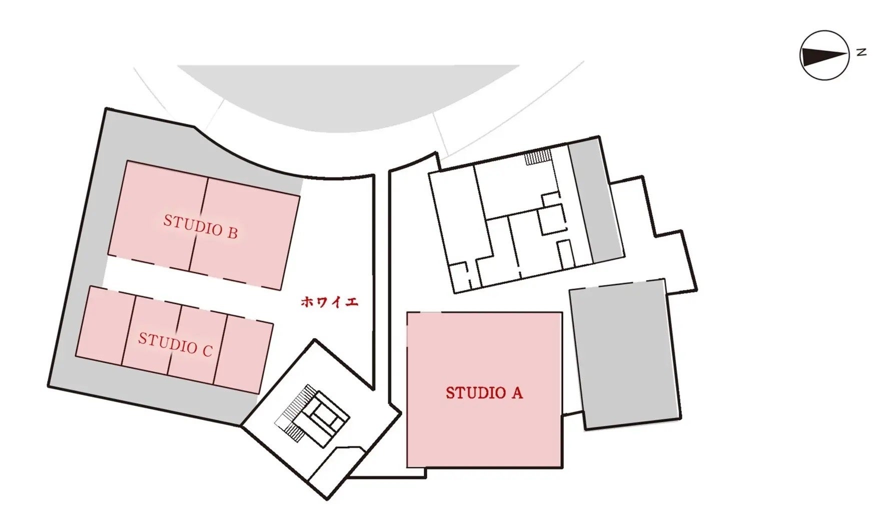 施設の大部分が地下に配置され、合計約1,400㎡の多彩な展示空間(スタジオ)が存在します。