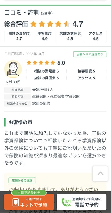 る口コミを参考にして、信頼できる保険ショップを検索できます。