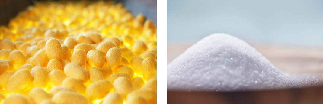 金繭シュガーモイッシュの原料となる金繭(Golden Silk No.11)はタイのシリキット王妃養蚕局が認可した契約農家だけでつくられ、無農薬の桑で育てた蚕が生み出す金繭を、化学薬品等を一切使わず特殊製法で化粧品原料として丁寧にパウダー化し、本品に配合しています。 金繭とともに配合されている甜菜糖は、古来より床ずれの治療に使われていたり、素肌を和らげ、傷を治癒するとされ、高い効果が実証されています。本製品で使用しているのは世界で唯一遺伝子組み換えをしていない北海道産の甜菜糖。この甜菜糖に5種の植物由来オイルコーティングをし、特別な金繭を配合。汚れを落としながら粘膜を保護し、うるおいをキープすることに成功しました。界面活性剤はもちろん、鉱物油、アルコール、合成香料、合成着色料、防腐剤など肌へのストレスになる成分を一切排除した、画期的なフェムゾーンケアなのです。