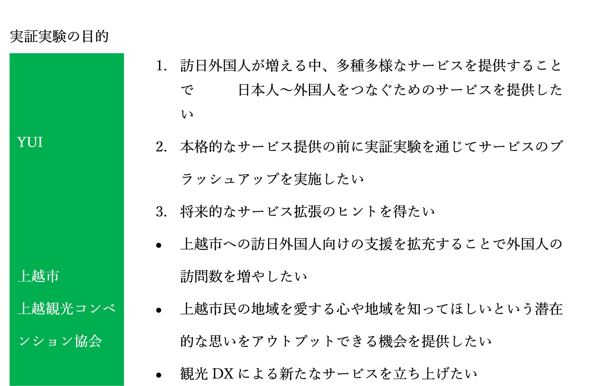 上越市を「自国に居るように楽しんでもらう」ために、「カルチャー、言語の壁」等を問わない「カルチャープラットフォーム」を提供することにより、円滑な「情報発信・双方コミュニケーション」体制の構築を目指します。実証実験には新潟県上越市(市長 中川 幹太)と公益社団法人上越観光コンベンション協会(会長 山田 知治)が協力し、実施します。また、本年1月1日に発生した能登半島地震をはじめとする自然災害からの避難において、被災していない地域からの言語支援により、円滑な外国人の避難を実現する点でも効果があるものと考えております。