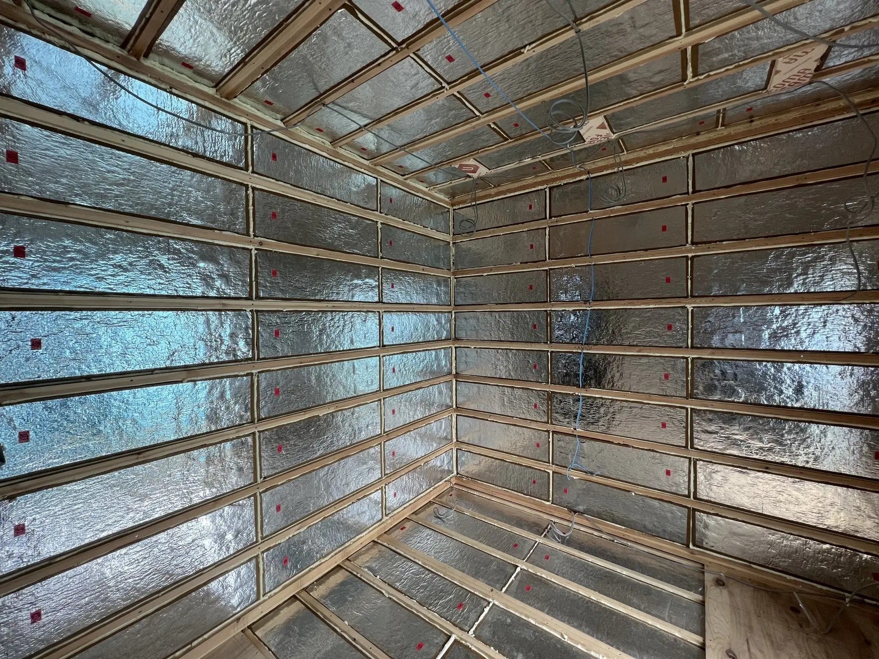 モデルハウスの一部屋には、JIS認証を得た建築用真空断熱材「VIP-Build(ピップビルド)」を使用しています。このわずか16mmの薄さで熱抵抗値4.0㎡k/Wを実現する最先端の断熱材によって、従来であれば諦めていた壁をこわすことができない場所にも、断熱を施すことを可能にしました。