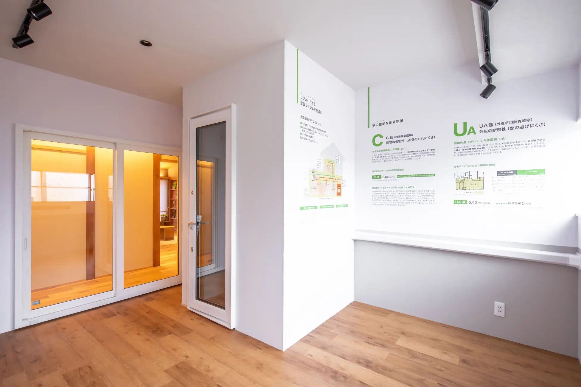 モデルハウスの一室には、「未断熱実験室」を設置しています。同じ住宅の中に、あえて断熱リフォームしない部屋を設けることで、断熱の有無によってどのくらい室温や湿度が変わるのかを、実際に比較・体感していただけます。
