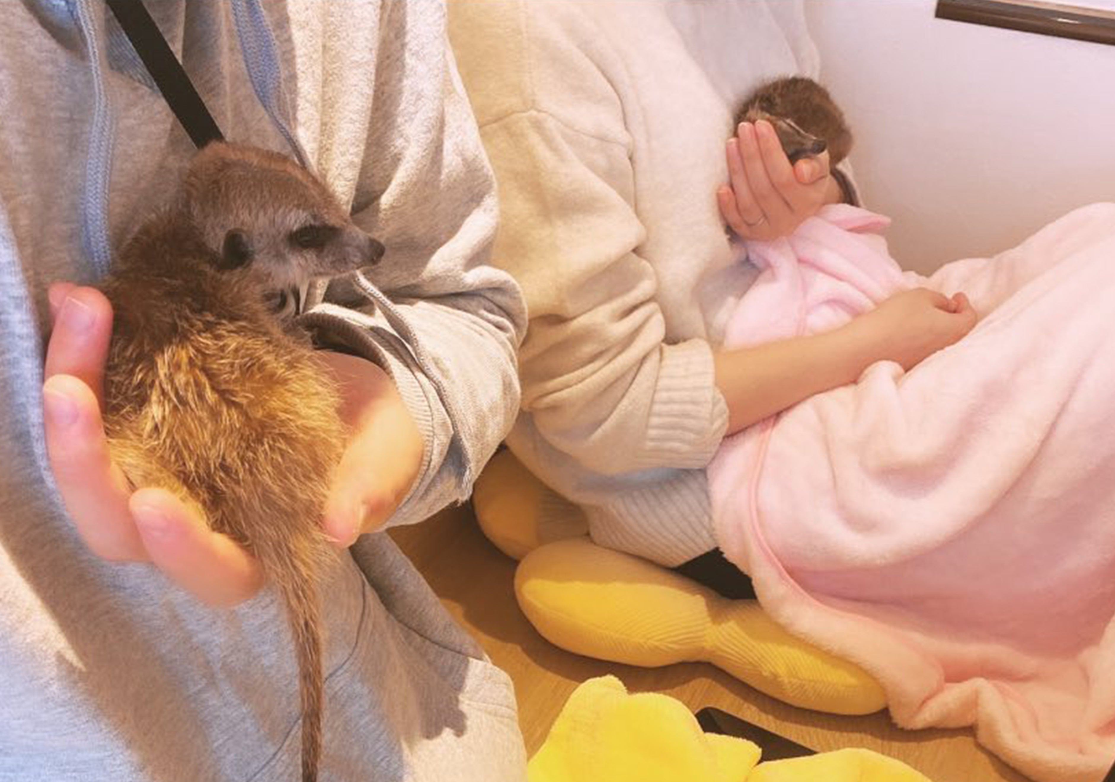 『ミーアキャットカフェgoogoo』には人になついているミーアキャットがたくさんいて、ゆっくりとミーアキャットと触れ合うことができることも特徴の一つ。