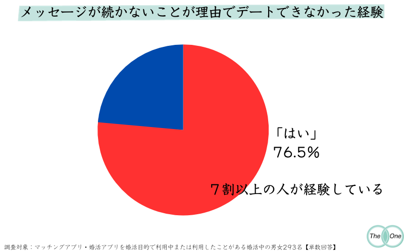 さらに、調査結果からは、マッチング後の”メッセージが続かないことが理由でデートできなかった経験”をした人が76.5%という実態が判明しました。メッセージ内容のすれ違いなどによって、”デートできない”を経験した婚活者が多く、メッセージ交換が出会うまでの高いハードルになっていることが考察されます。