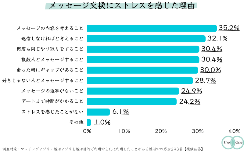 その理由の上位を見てみると”メッセージの内容を考えること”、”返信しなければいけないと考えること”と続き、メッセージ交換という行為自体に疲れを感じている婚活者が多いことが読み取れます。