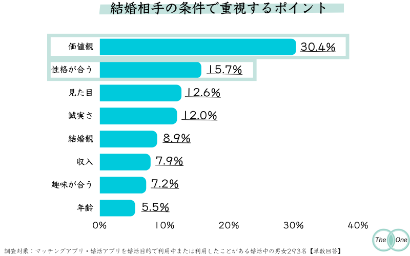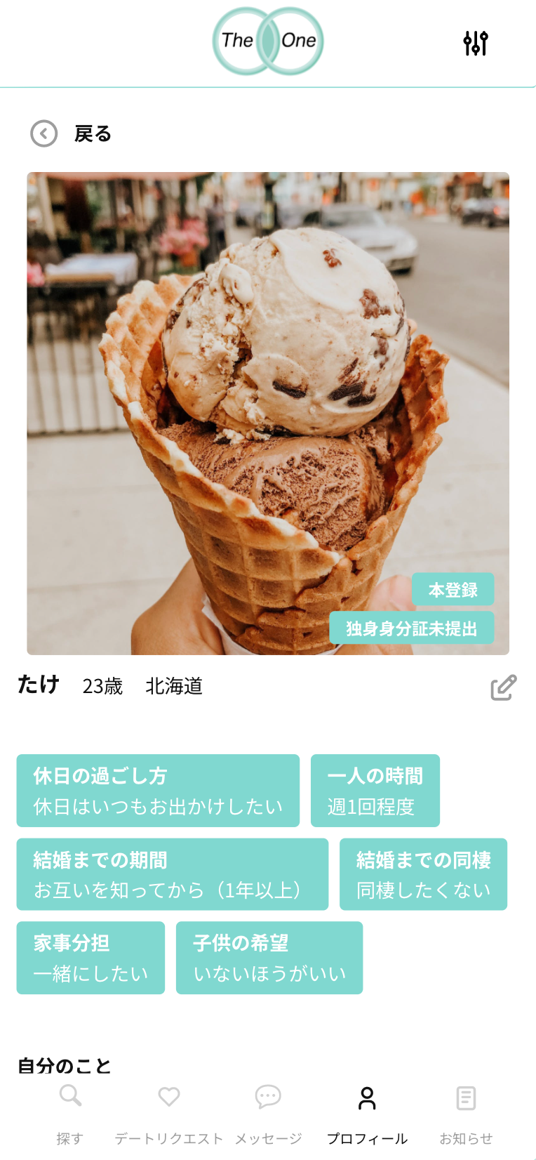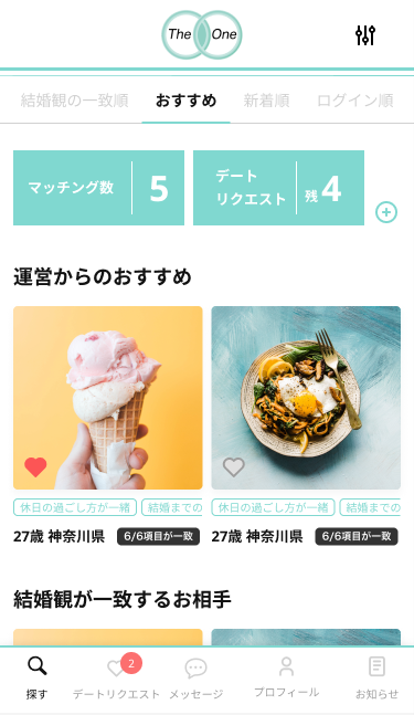 価値観重視の婚活アプリ「The One」は、”薄毛などの見た目“、”恋愛経験の少なさ”、”離婚経験”、”病気”などにより、婚活がうまくいっていないと感じている人のための婚活アプリです。