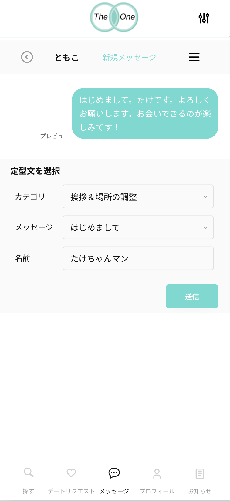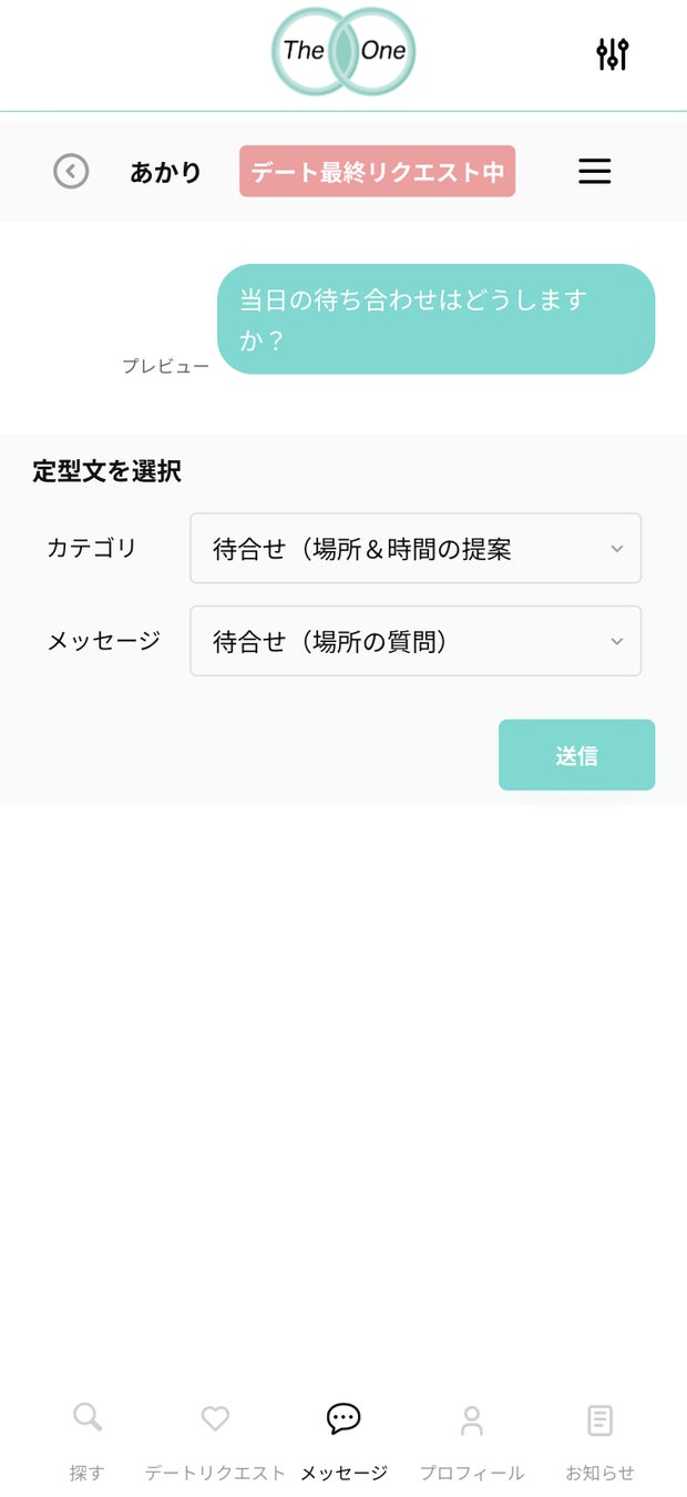 必要ヵ所だけ入力すればデートの調整までできる定型文のメッセージ機能。