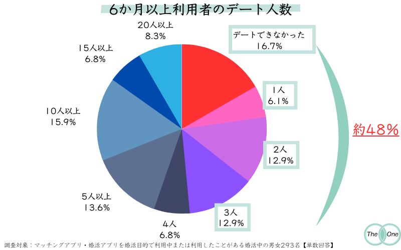 さらに、利用期間が6カ月以上の婚活者のうち「デートした人数が3人以下」の割合は約半数の48%となっており、これらの婚活者は月平均で0.15人しか出会えていない結果になっています。