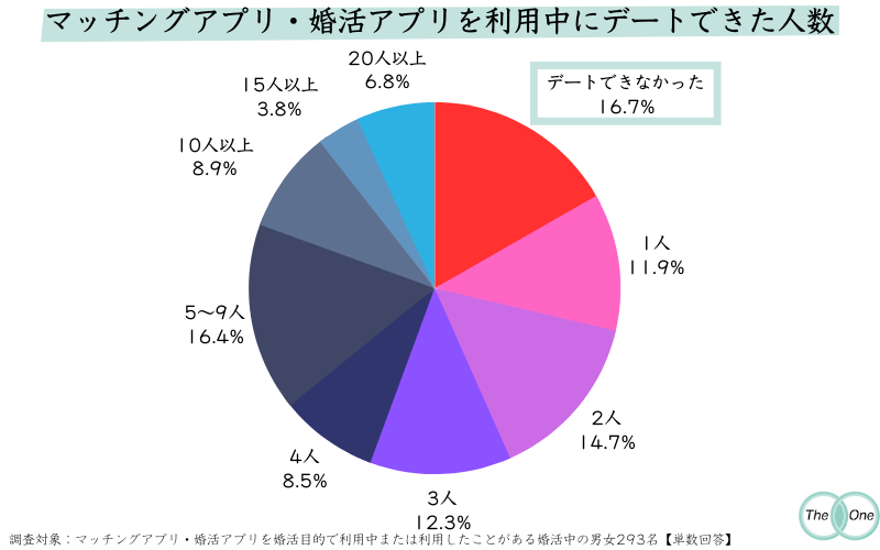 婚活目的の利用者が増加しているマッチングアプリ・婚活アプリですが、調査の結果、アプリ利用期間中に”デートできていない”婚活者が約16.7%という結果になりました。また、デートした人数が3人以下の人は全体の55.6%、約半数以上ということも判明しています。