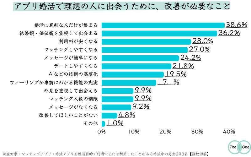 今回の調査では、”マッチングアプリ・婚活アプリを利用したアプリ婚活で理想の人に出会うために改善が必要なこと”のアンケートを実施した結果、利用者は”婚活に真剣な人だけが集まること”、”結婚観・価値観を重視して出会えること”などの改善を求めていることが分かりました。
