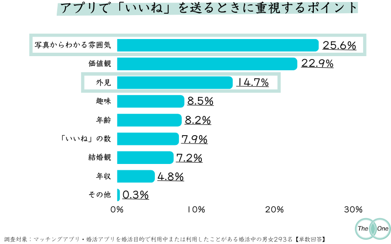 調査結果では、結婚相手には”価値観”などの内面を求める回答の割合が高くなっていますが、アプリ上で相手を選ぶときには”プロフィール写真からわかる雰囲気”などの外見を求める回答の割合が高くなる傾向に。