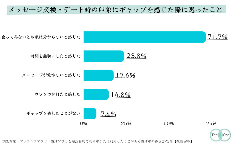 さらに、”メッセージ交換時に思っていた相手の印象”と”デート時の印象”に”ギャップ(違い)”を感じたことがあるが92.6%とギャップを経験した婚活者が多くなっていることに加え、ギャップを感じた際、”直接会ってみないと人の印象などは分からない”と思ったとの回答が多く、メッセージだけでは相手のことを理解するのは難しいという課題も。