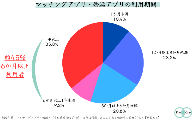調査の結果、6カ月以上利用している婚活者が約45%、1年以上利用しているユーザーが約35.8%と長期間利用している人が半数程度と判明しました。
