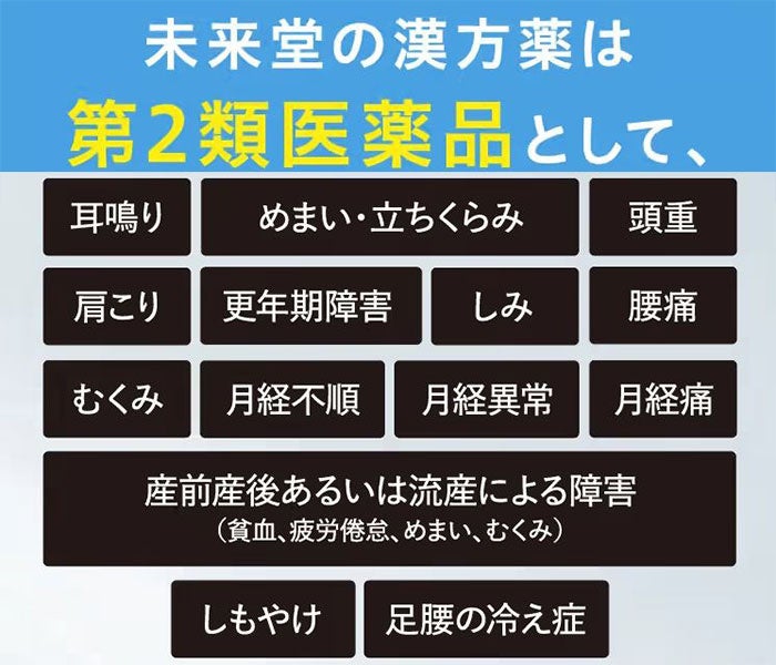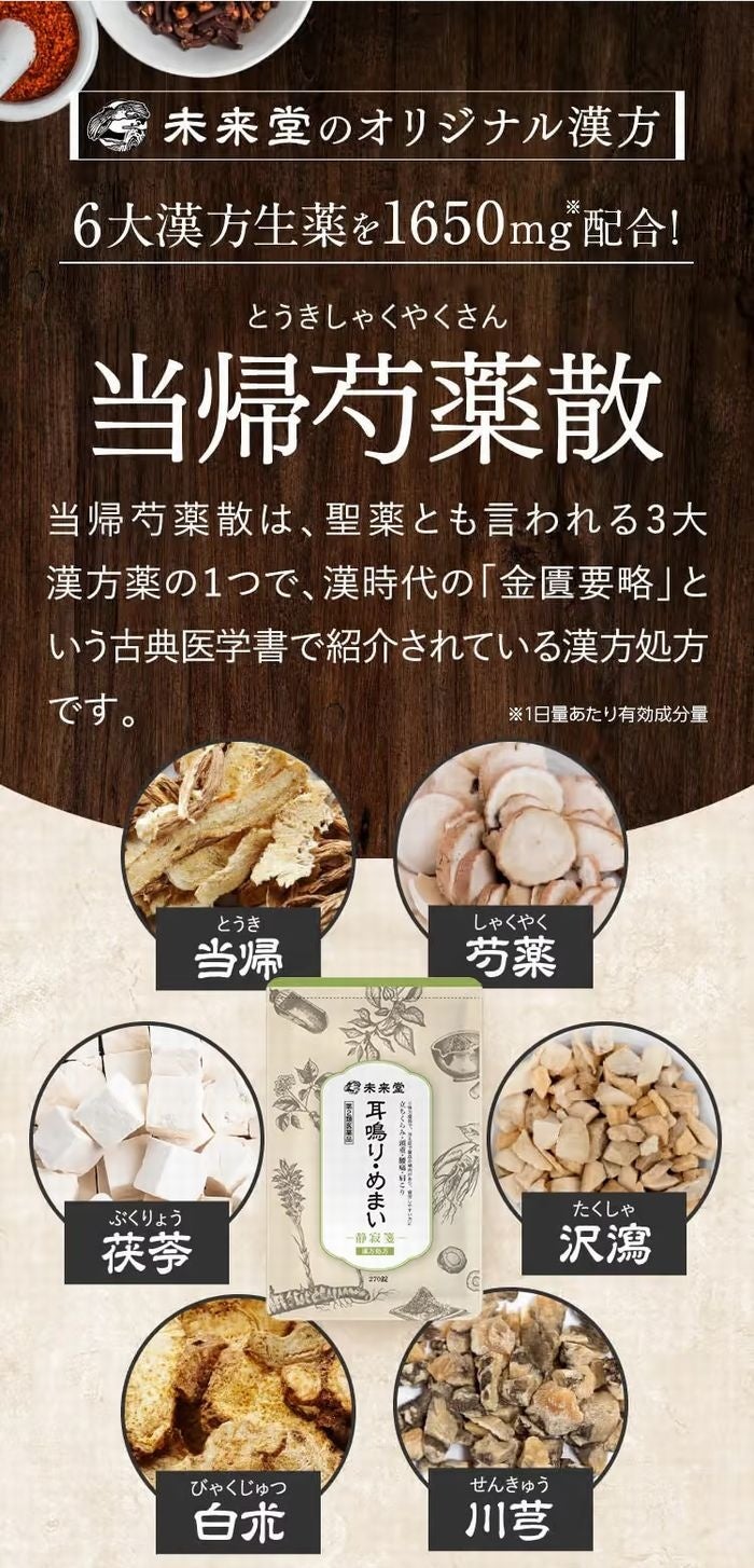 漢方処方において、耳鳴り・めまいは、水と血が原因でおこると考えられています。未来堂の当帰芍薬散はその水と血に作用して崩れたバランスを整え、耳鳴り・めまいを改善いたします。