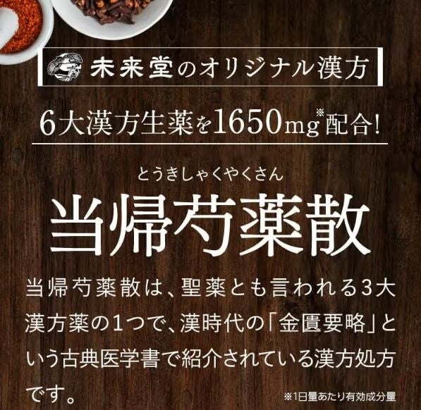 特徴1:未来堂オリジナル漢方、6大生薬を1650mg※配合した「当帰芍薬散」処方