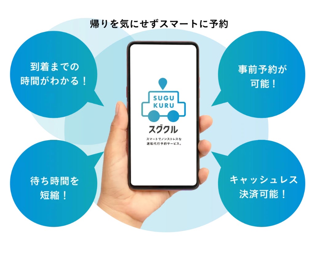 同時に、運転代行をスマートフォンから配車・予約ができるアプリ=「スグクル」を開発し、サービスの提供を開始しました。