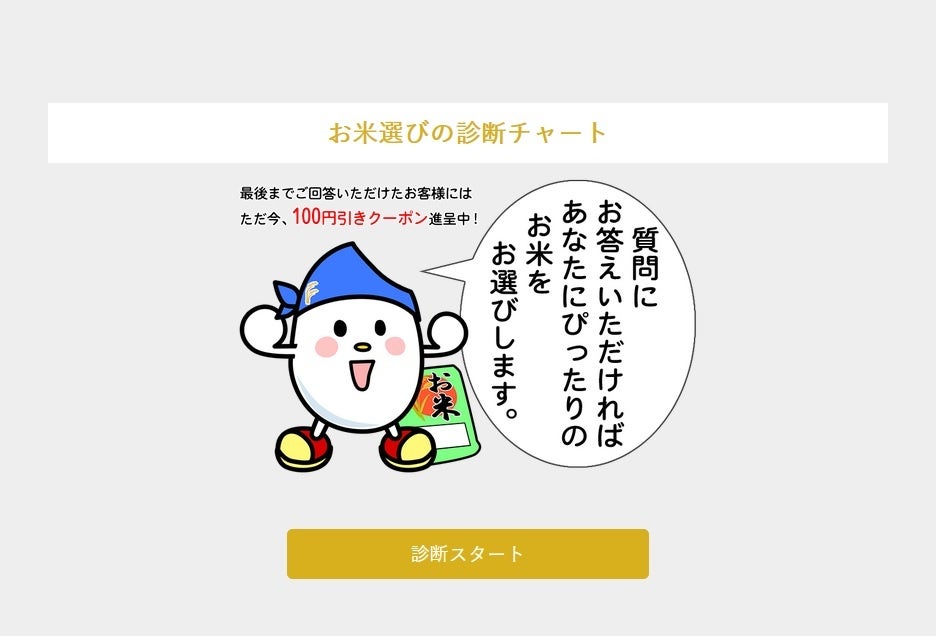 3~6問の簡単な質問に答えるだけで、自分の好みに合うお米を見つけることができます。(https://fukuinokomeya.com/html/page28.html)