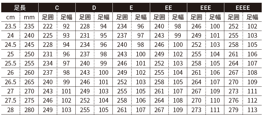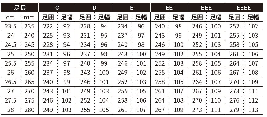 サイズ(足長):23.5 - 28cm(0.5cm 刻みの10 サイズ)