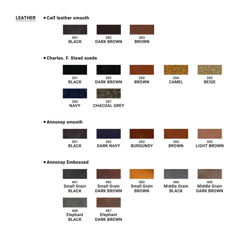 レザーは3 つのタンナーの4 種類のレザーからお好みに合う色をお選び頂きます。