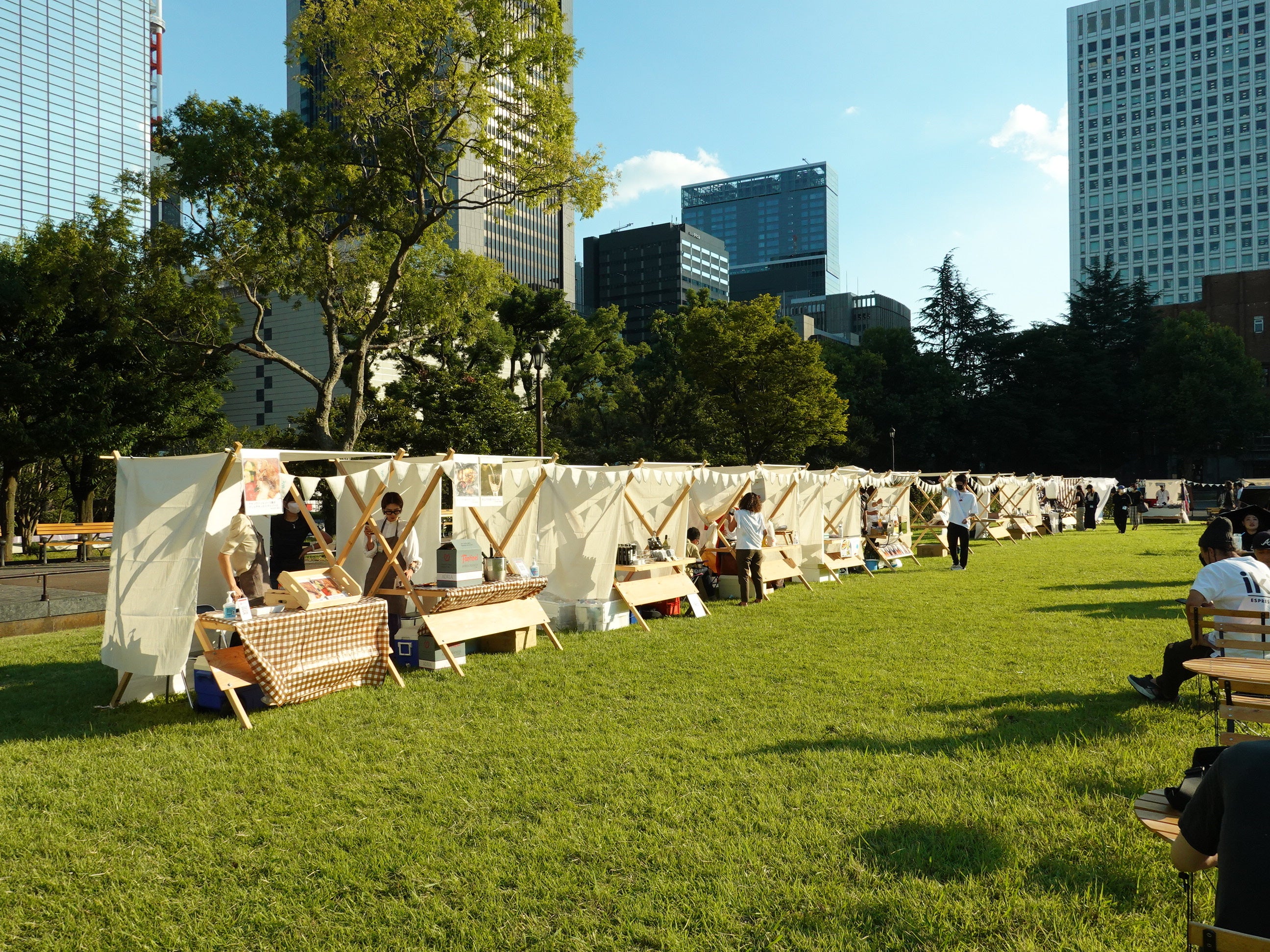新型コロナウイルスの影響が少なくなり活気が戻ってきた屋外イベントで、天然木と布でつくられたスタンドは優しさと温もりのある風景をつくることができます。
