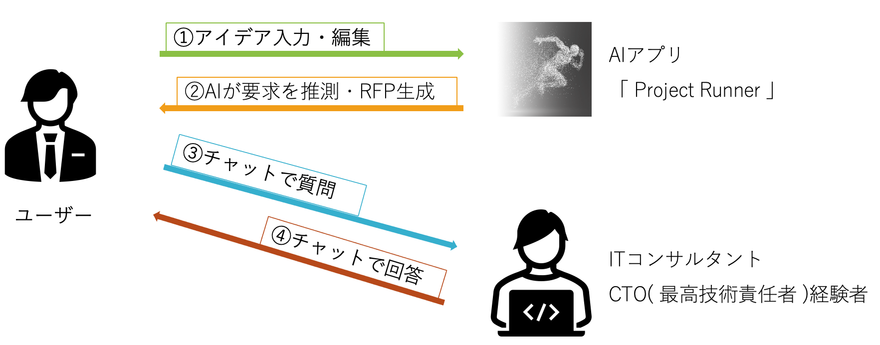AI CTO は、当社独自開発のAIアプリ「 Project Runner (プロジェクト・ランナー) 」とスタートアップ企業の CTO 経験者による ITコンサルティング の提供により、要求定義のプロセスを変革し、企業のDX推進および新規事業・新サービスのシステム開発プロジェクトの成功に貢献します。