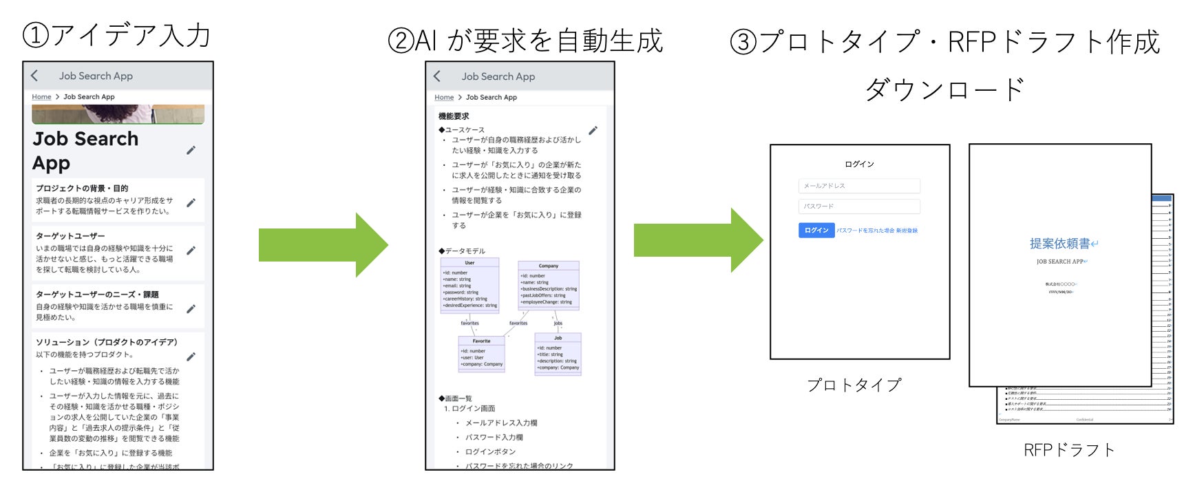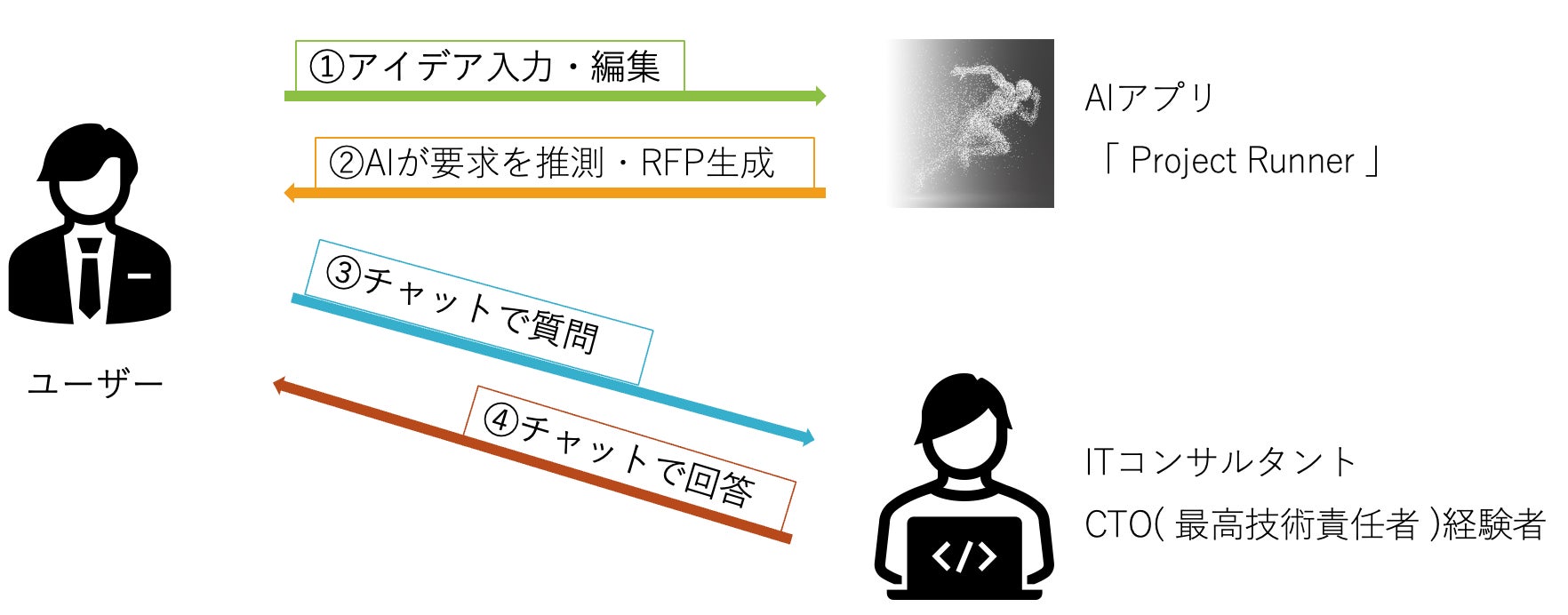 AI CTO の利用者は、「 Project Runner (プロジェクト・ランナー) 」に、実現したいことの簡単なアイデアを入力するだけで、システムのプロトタイプと RFP(提案依頼書)のドラフトを自動生成できます。曖昧な要求をプロトタイプとして可視化し、要求の具体化と取捨選択に役立てることができます。さらに、プロトタイプのコードや RFP の内容、技術的な課題の解決策などについて CTO の助言を受けながら、 RFP を完成させることができます。