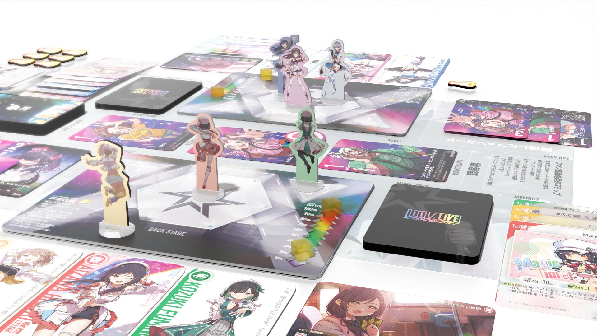 本作はTCGライクなカードゲームながら、厚紙製のフィギュア・ボード・チップも用いてアイドルのライブを再現。卓上を華やかに彩ります。盤面に置かれたステージ上でアイドルを動かし、歌唱やファンサでライブ会場を盛り上げましょう。