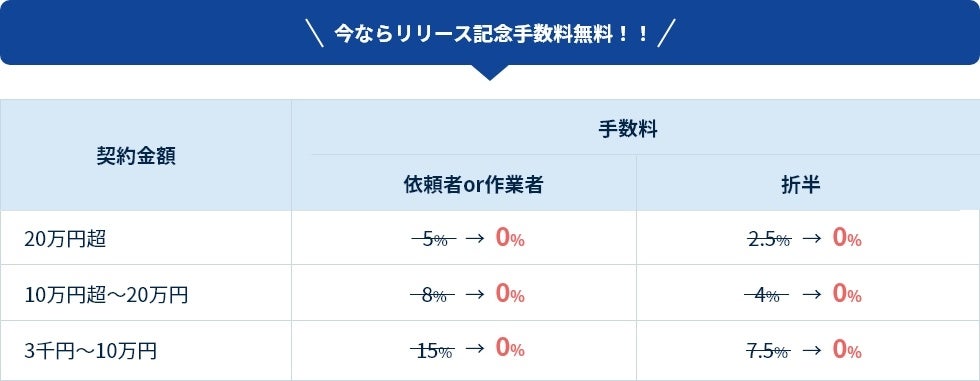 カリバライでは依頼者と作業者で手数料を半分ずつ負担する事が可能で、最も低い手数料である2.5%の手数料を実現しました。無料会員登録、初期・月額費用も無く登録審査も不要です。独立したてのフリーランスの方でも気軽にご利用いただく事ができます。