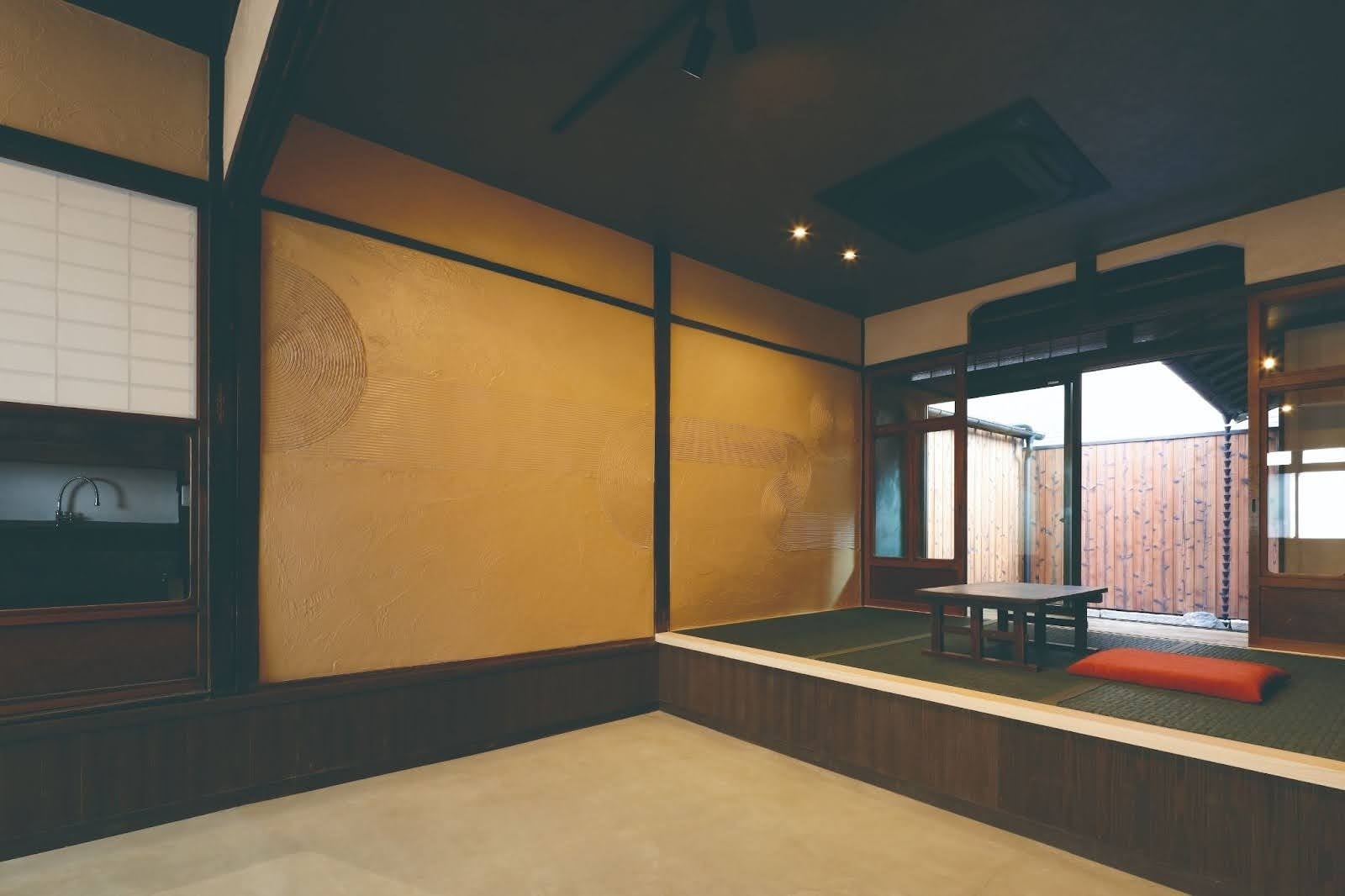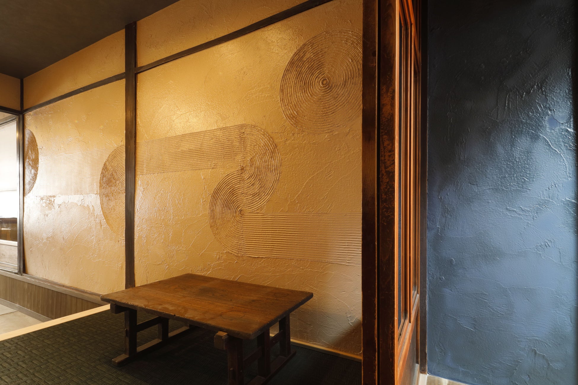 つつじ、やなぎ、柿渋、墨茶などあたたかみのある色で仕上げた漆喰を実際に見て、触れていただけるスペース。京町家ならではの火袋やおくどさん(かまど)をそのまま残し、初めて訪れても心が落ち着く和モダンな空間に仕上げました。