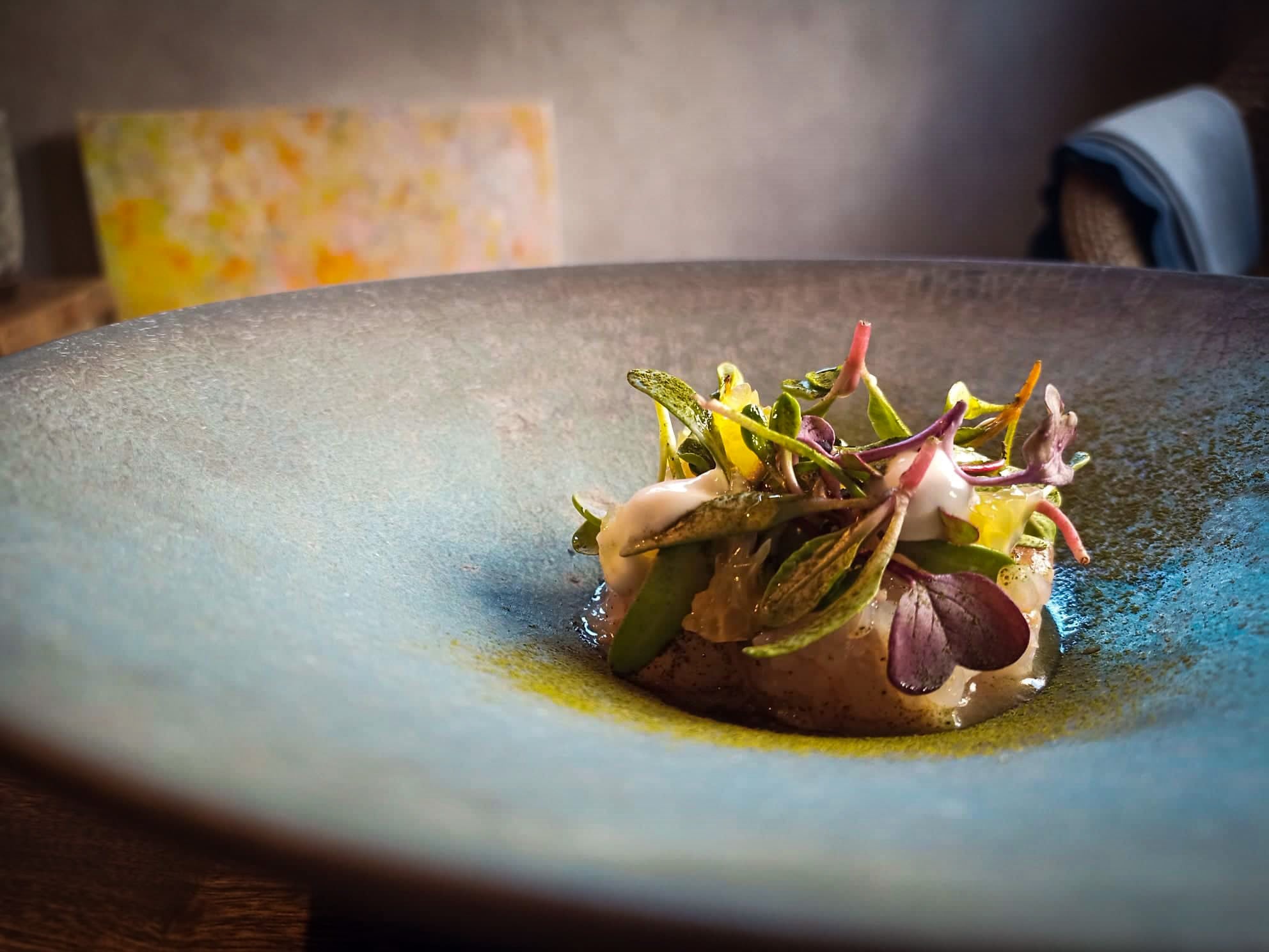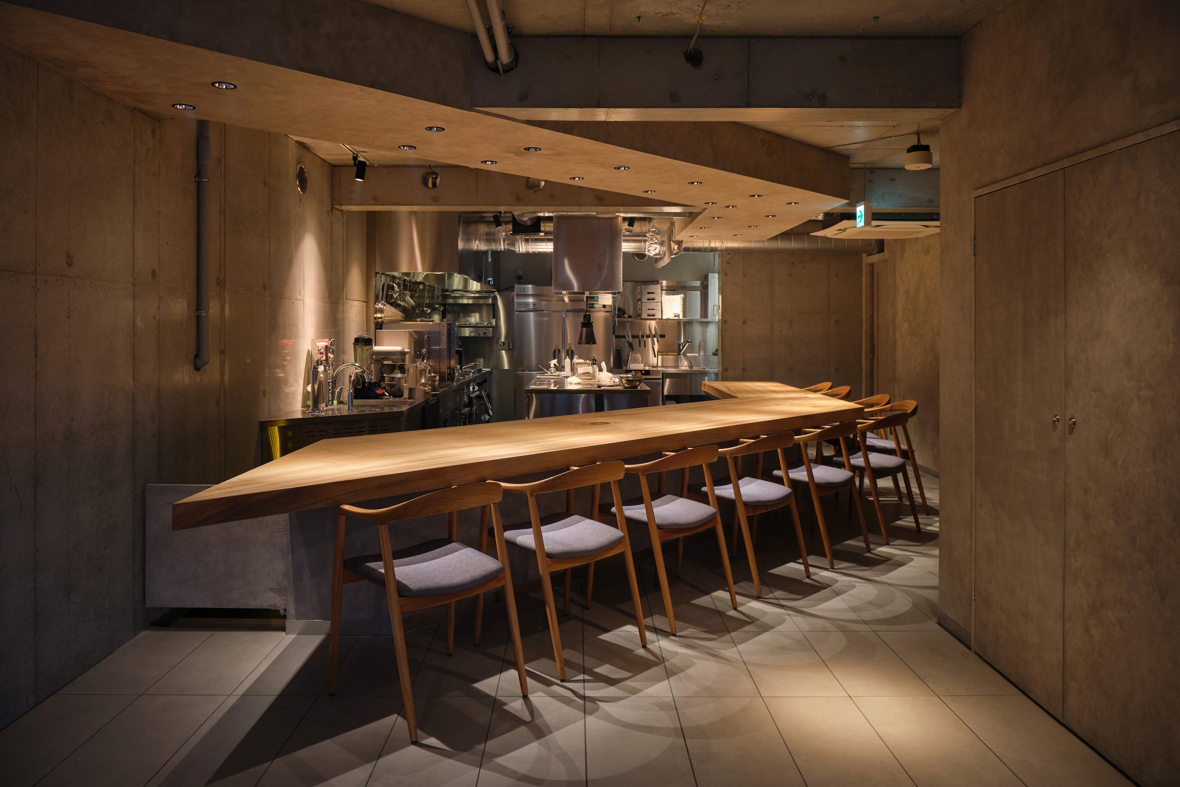 樹齢400年の楠から切り出した一枚板のカウンターや、国産の欅を使った椅子など、天然木の美しい質感にこだわったシックなインテリアの店内では、都内フレンチレストランにて修業を積んだ経験豊かな料理長 日吉 瑞己と、日本最大級の料理人コンペティション「RED U-35」において2022年ブロンズエッグを受賞した若き料理人 辻岡 靖明が、オリジナリティ溢れる洗練されたカウンタースタイルのモダンフレンチを提供いたします。
