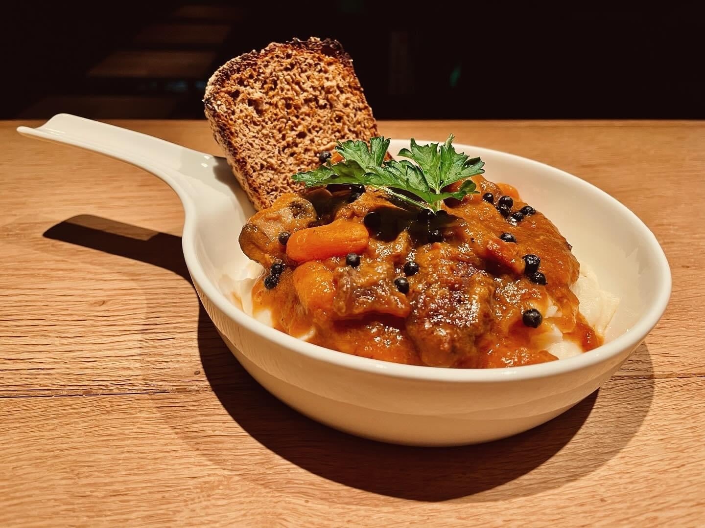 ホクホクのポテトの上に、とろけるような風味豊かな牛スジ肉の煮込みを惜しげもなくトッピング。ライ麦パンに乗せてお召し上がりください。牛肉の煮込みにはコラーゲンがたっぷり含まれています。また見た目以上にボリュームがあるためお食事としても、またカップルでのシェアなどもおすすめです。