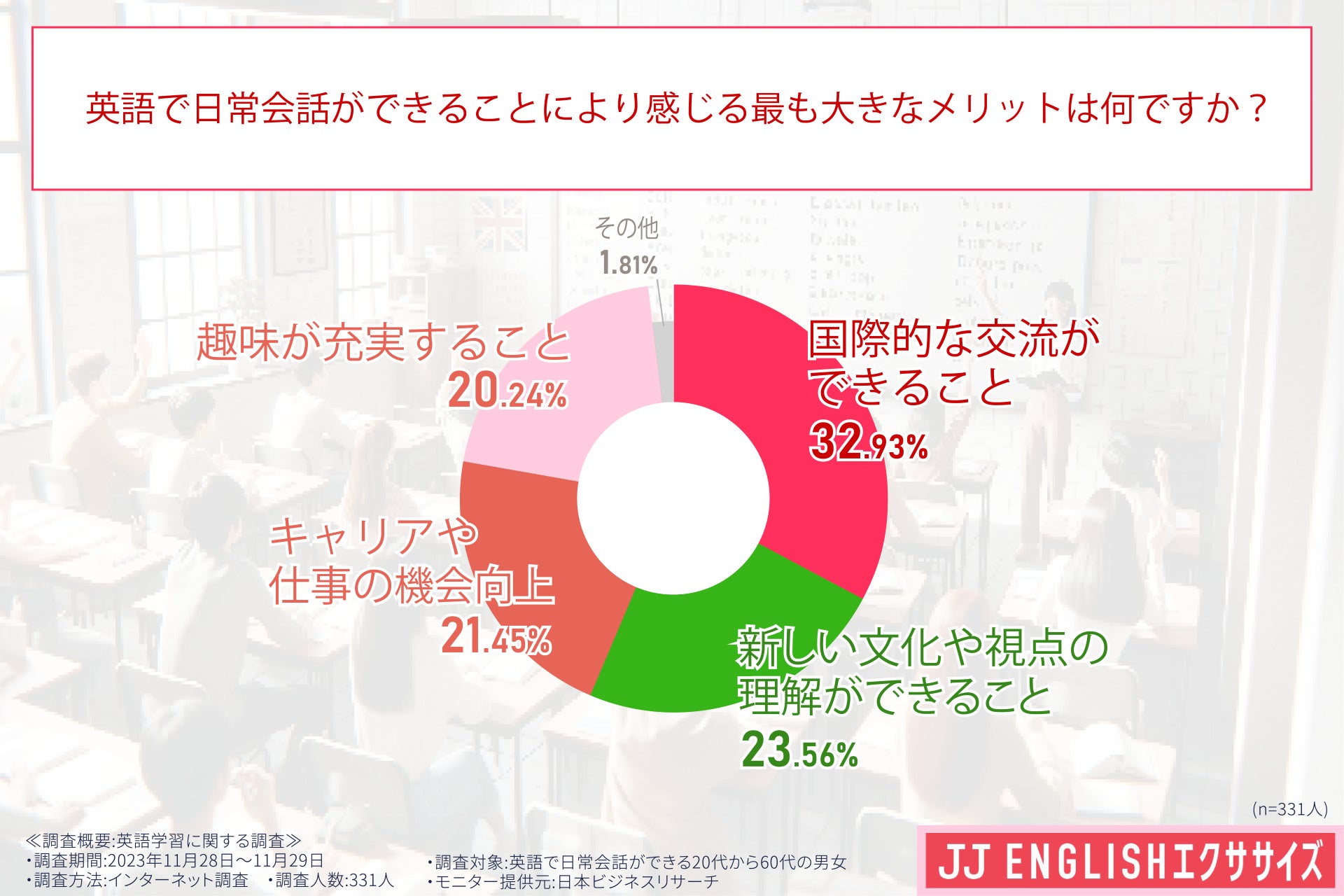 そこで、株式会社JJイングリッシュ社(URL:https://jjenglish.co.jp/ )は、英語で日常会話ができる方(20~60代の男女)に対し、英語学習についての調査を実施しました。