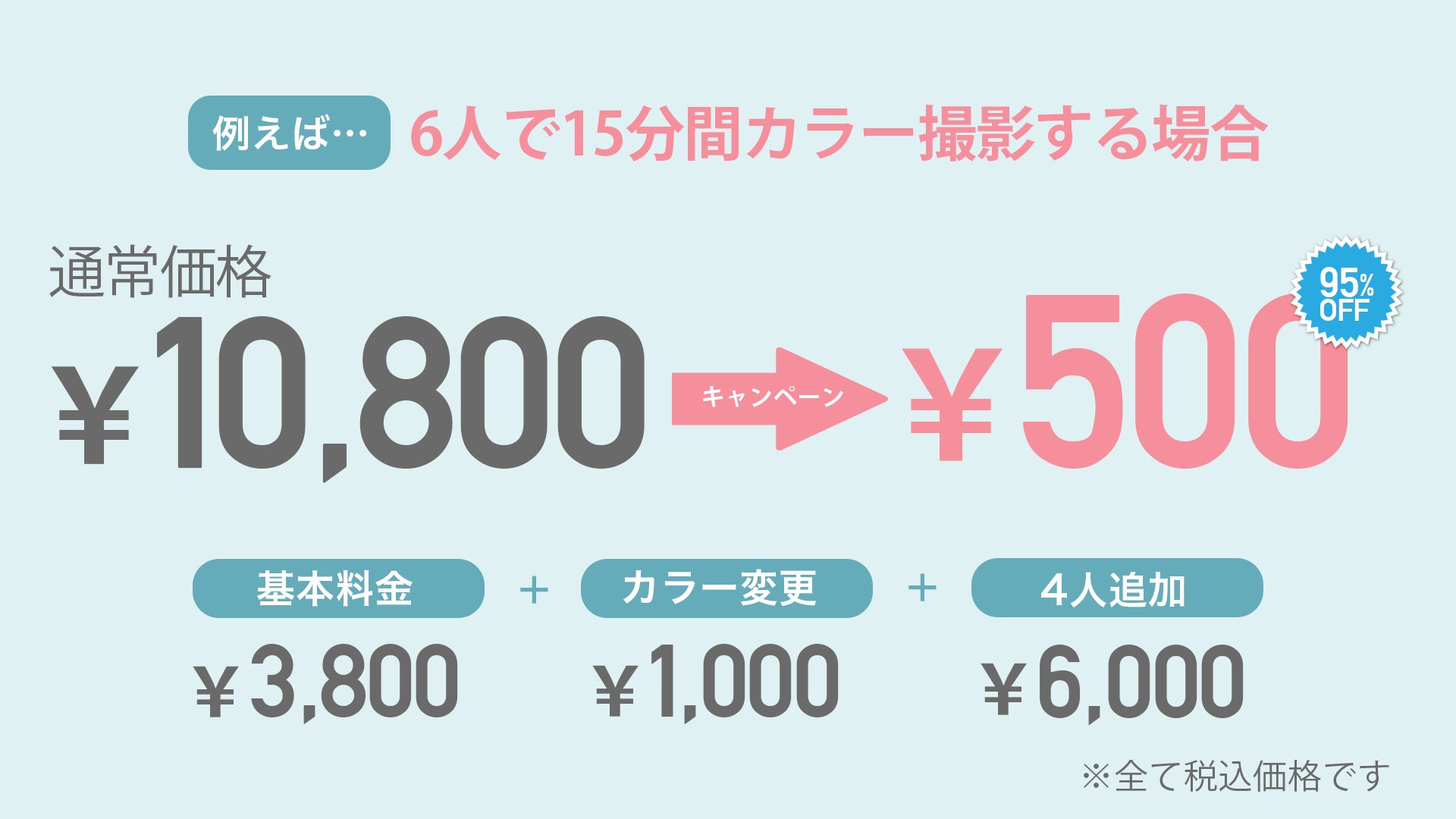 ※1グループあたり6名様まで同一価格です。 7名以上の場合は2組以上に分かれて撮影をお願いします。 ※ご利用は1日1回に限ります。 ※30分への時間延長は、通常価格の1名あたり1,500円の追加料金を頂戴します。 ※撮影前後にご説明の時間としてそれぞれ5分程度いただきます。 ※他の割引とは併用できません。 |