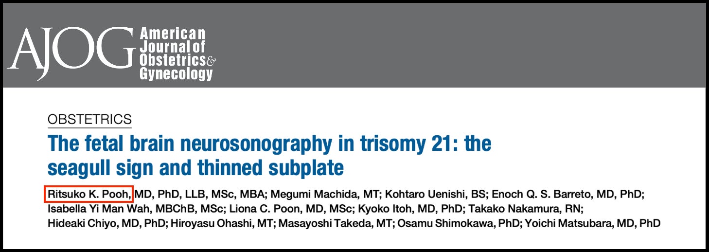 クリフム出生前診断クリニック院長(大阪)の夫 律子(ぷぅりつこ、Ritsuko K. Pooh)医師を中心とした国際研究チームは、ダウン症候群の胎児脳に特徴的な2つの形態学的マーカー「カモメサイン」と「菲薄化サブプレート」を世界で初めて発見しました。この研究成果は、産婦人科学分野の最高峰ジャーナル『American Journal of Obstetrics & Gynecology(AJOG)』に掲載され、発表後わずか数週間で同誌の「Most Read Articles Top 10」に選ばれました。