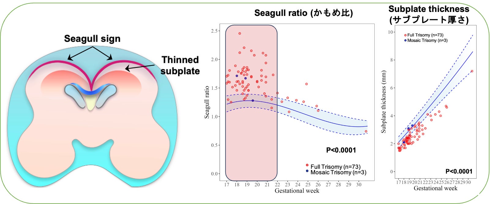 一方、「菲薄化サブプレート」は、胎児期にのみ存在する特殊な脳層であるサブプレートの厚さが薄いという所見で、妊娠30週まで持続的に観察されました。