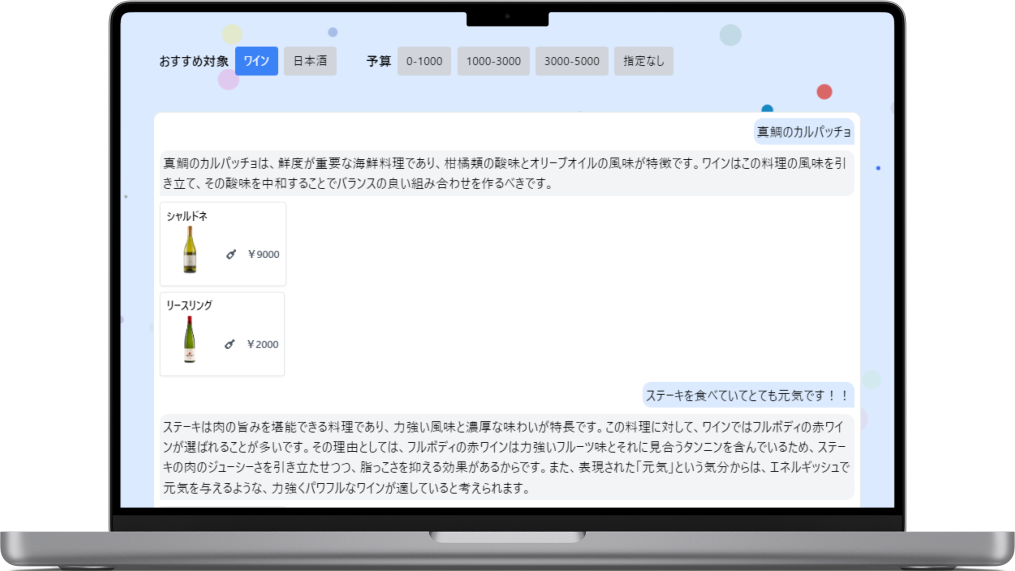 レコメンド結果の出力にあたっては飲料に特化した高性能レコメンドエンジンが利用されているため、利用者のあらゆる要望に対応したやり取りが可能です。