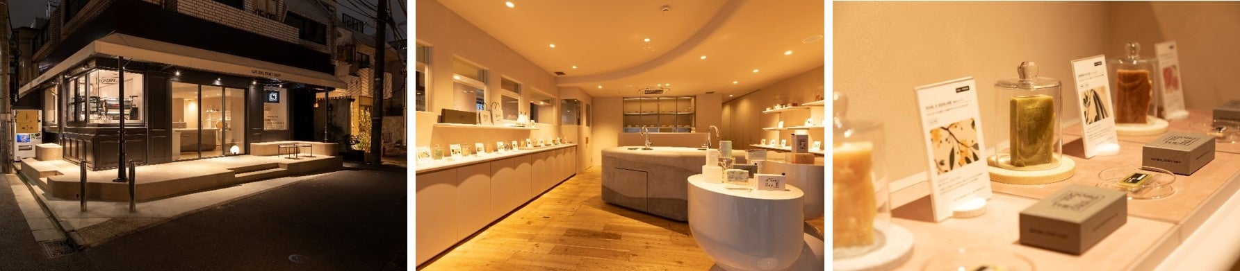 「THE COLD PROCESS表参道本店」の店内外に広がるナチュラルな素材感や丸みを帯びた柔らかなフォルムは人の健やかな肌をイメージ。店内のディスプレイには使われなくなった人工大理石をリユースし、環境にも配慮しています。