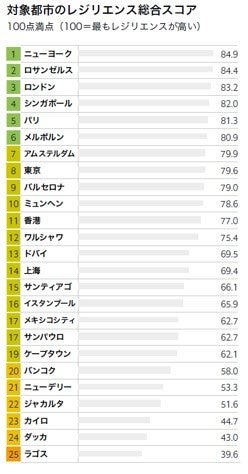日本の調査対象都市として東京が選ばれ、都市レジリエンスの総合ランキングでは25都市中8位にランクしました。都民の日常的な移動手段としての公共交通機関の発達、緊急時の対応時間が10分以内であること、大気の質などが評価されました。