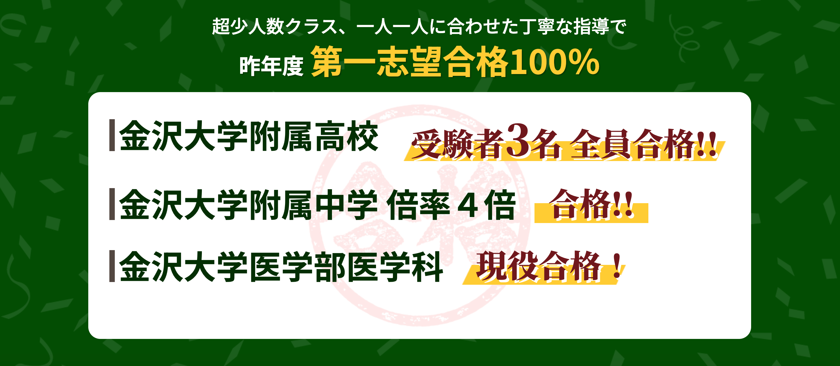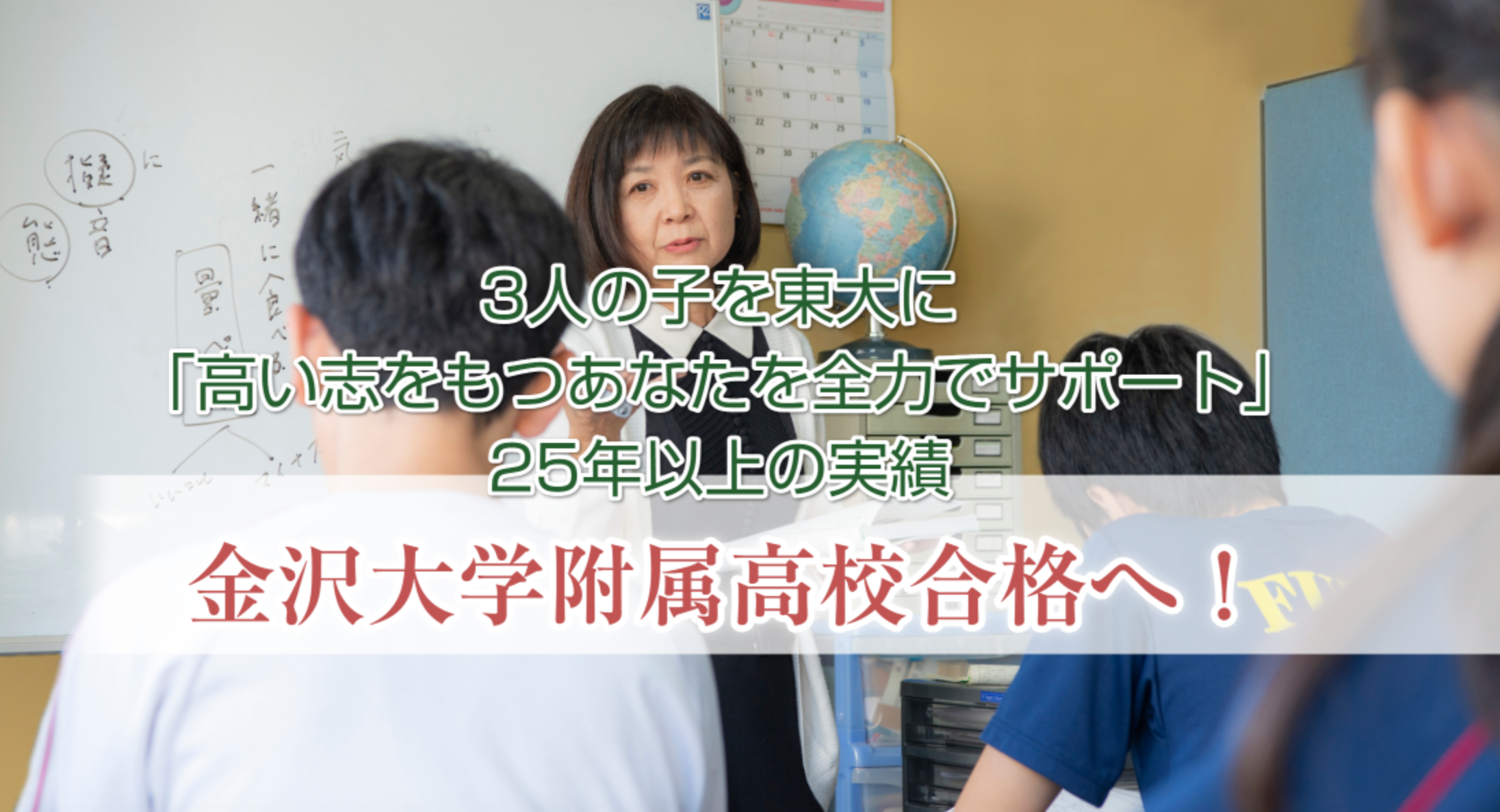 金沢大学附属高校・中学校受験25年以上の実績【県内屈指の合格率】超少人数クラス、一人一人に合わせた丁寧な指導で合格を目指そう!!来年度、生徒募集開始!!「スクールオークM香林坊」