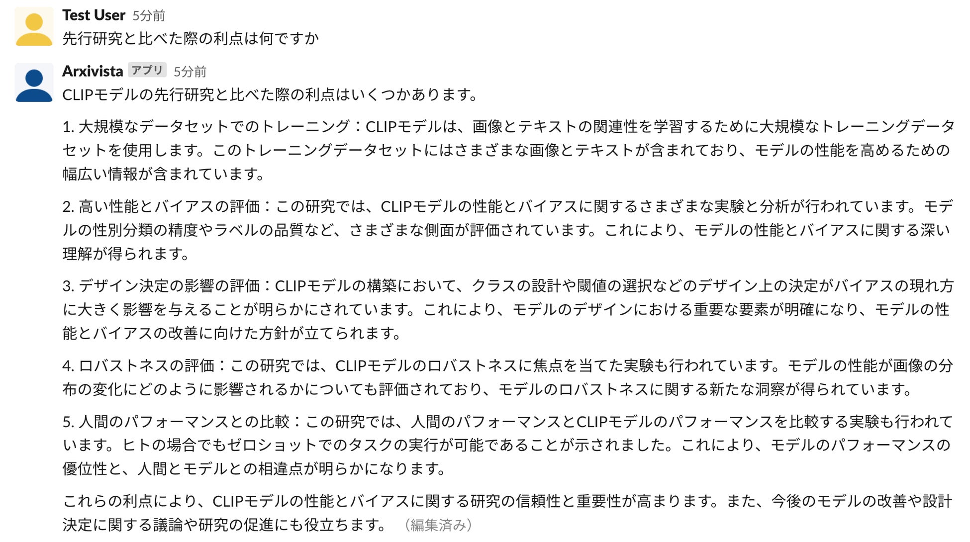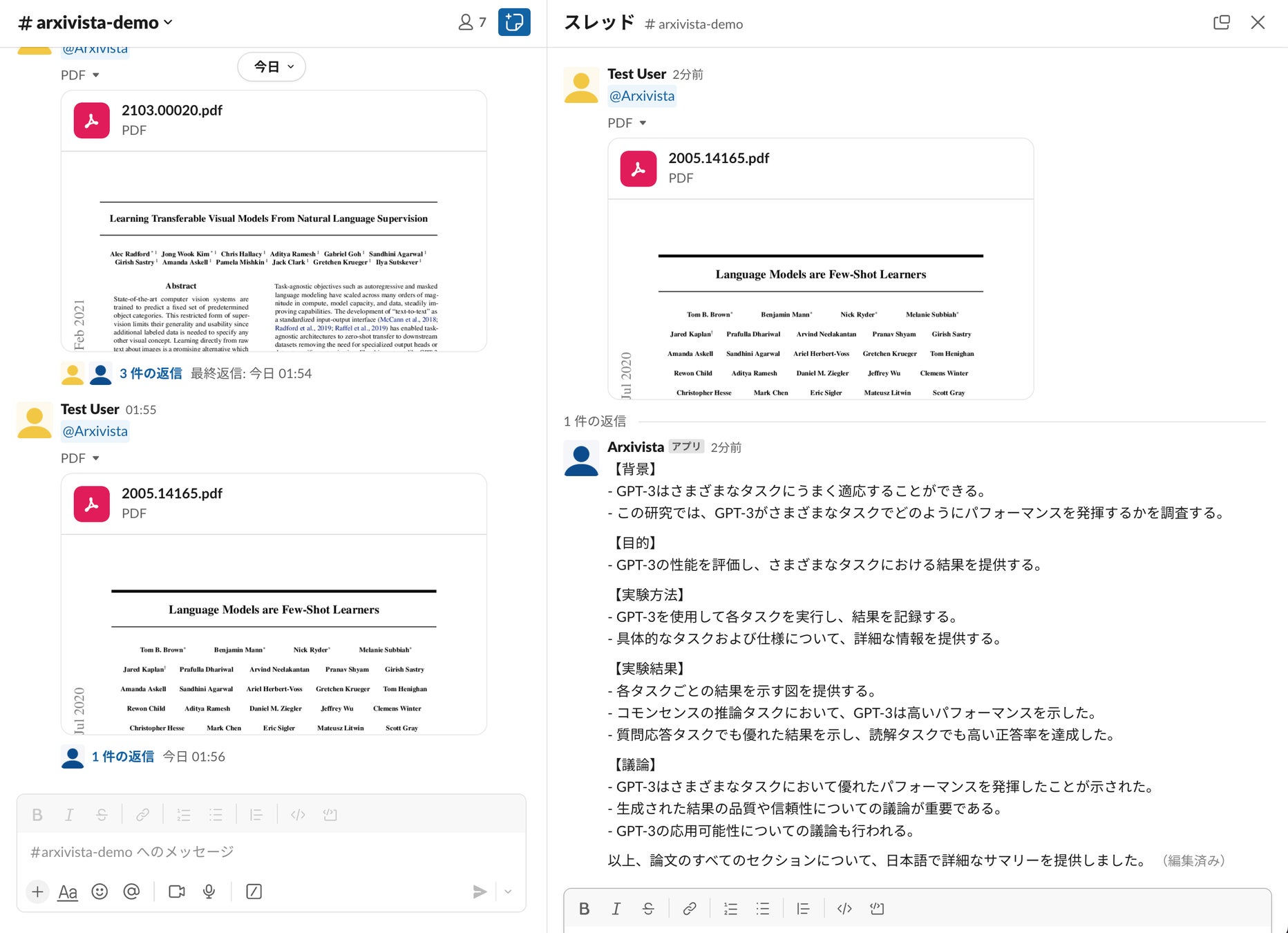 既存のサービスでは、論文をPDF化してアップロードする手間がかかったり、正確性が不足していました。Arxivistaは、arXivのURLや論文のPDFをslackに送信するだけで利用可能です。また、自動的に切り出された図表と要約の出力を元に、該当論文に関する対話や質問をすることができます。