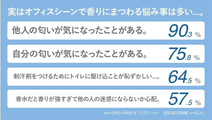 アンケートによるとオフィスシーンで他人の匂いが気になったことがある人は90.3%自分のの匂いが気になった人が75.8%と、匂いについて何かしら悩み事がつきまといます。